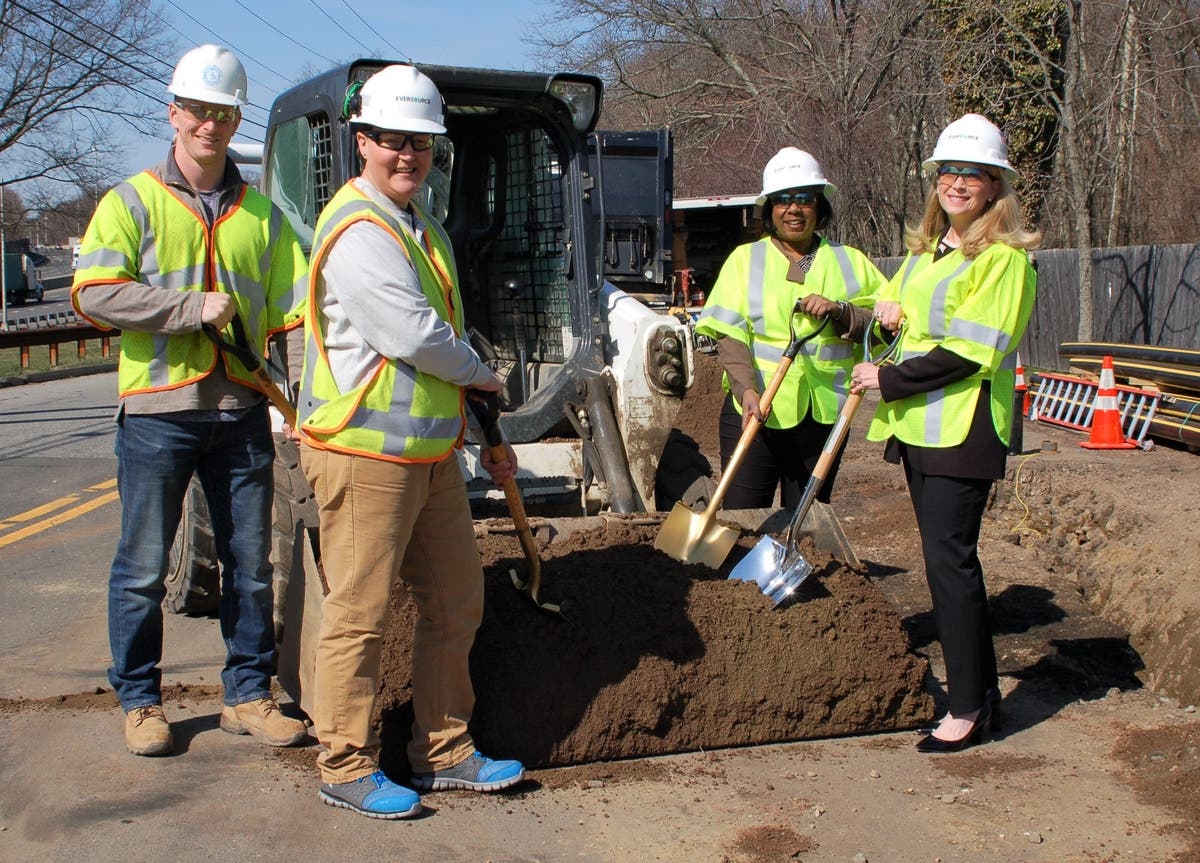 Photo: Darien First Selectman Jayme Stevenson (right) marks the start of natural gas expansion work in Darien with (left to right) Matt Johnson, Feeney Bros. Utility Services; Heather Adrian, Eversource Construction Supervisor and Tracey Alston, Eversource Community Relations Representative. Photo credit: Eversource
