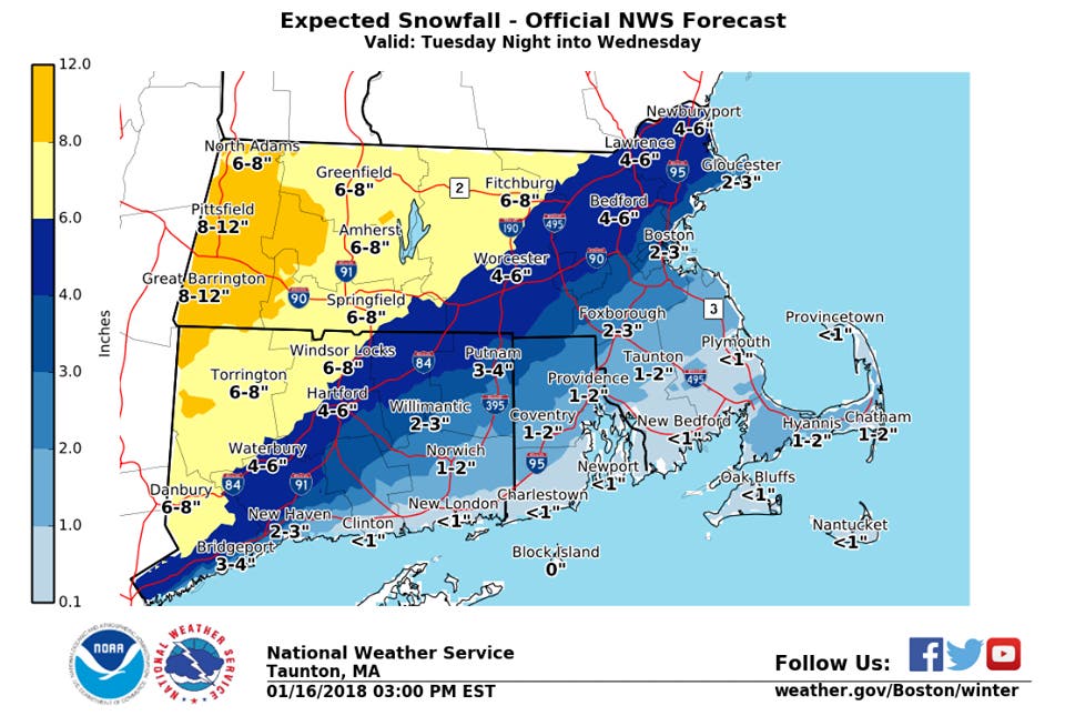 "The highest snowfall totals are still expected across interior southern New England, where many locations should receive more than 6 inches of snow. Keep in mind the bulk of this storm will occur between 5 AM and 10 AM Wednesday, which includes the morning rush hour. You'll still need to leave extra travel time, even in the areas where we've lowered snowfall amounts. Plan ahead!," The weather service said.
