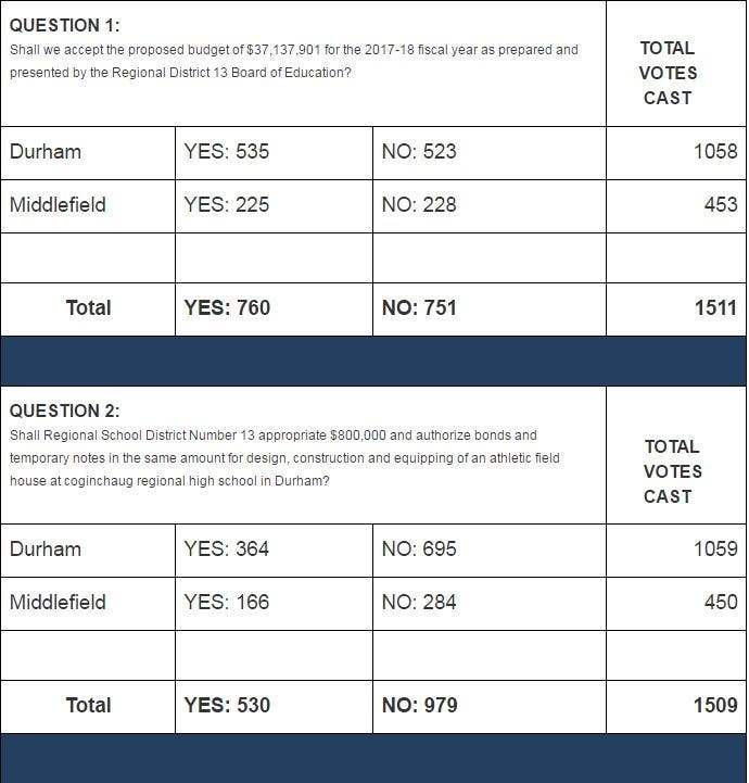 A separate question regarding a proposed athletic field house at Coginchaug Regional High School failed with 530 in favor and 979 against.