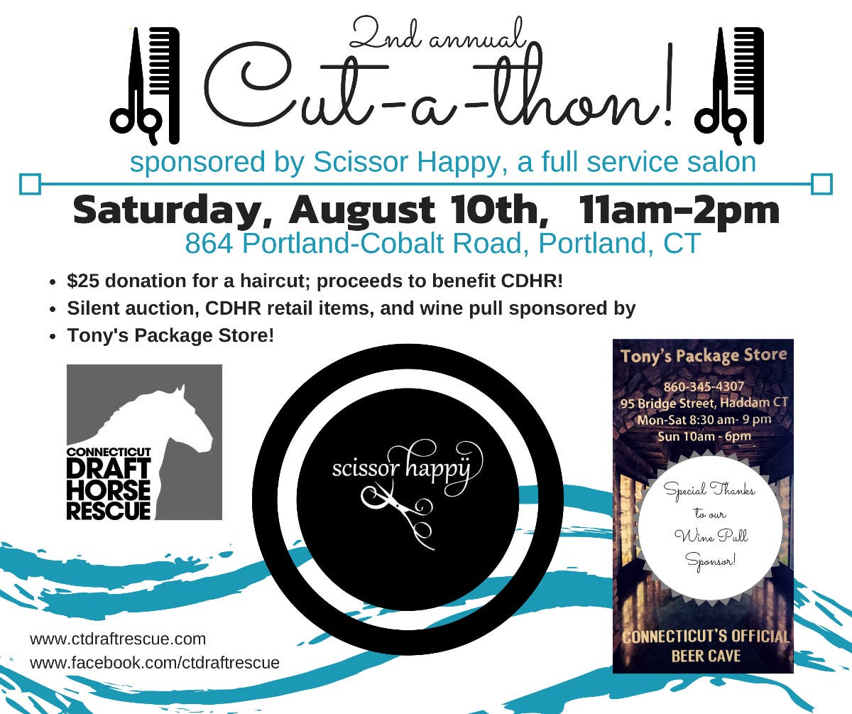You’re invited to join us for the 2nd Annual Cut-a-thon to benefit the Connecticut Draft Horse Rescue on Saturday, August 10th 2019 from 11am-2pm. The Cut-a-thon has been generously sponsored by the Scissor Happy Salon (864 Portland-Cobalt Rd, Portland, CT 06480). For a $25 donation you can get your haircut, styled or braided! No appointments necessary!