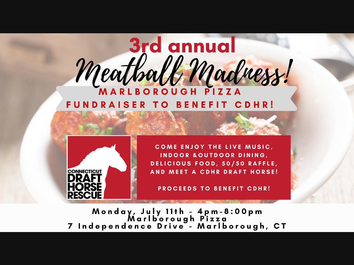 Please join us for the 3rd Annual Meatball Madness on Monday, July 11th from 4pm to 8pm at Marlborough Pizza & Restaurant (7 Independence Dr, Marlborough, CT 06447) to help raise funds for the CT Draft Horse Rescue, a non-profit organization located in East Hampton, CT, that is dedicated to saving the lives of neglected or abused draft horses as well as draft horses headed to slaughter. Come enjoy the live music and outdoor dining and even meet one of the CDHR horses! Bring a friend, bring a date, and bring your appetite because a percentage of the proceeds on all items sold (food, alcohol, and takeout) will benefit the CDHR! There will be a 50/50 raffle, too.