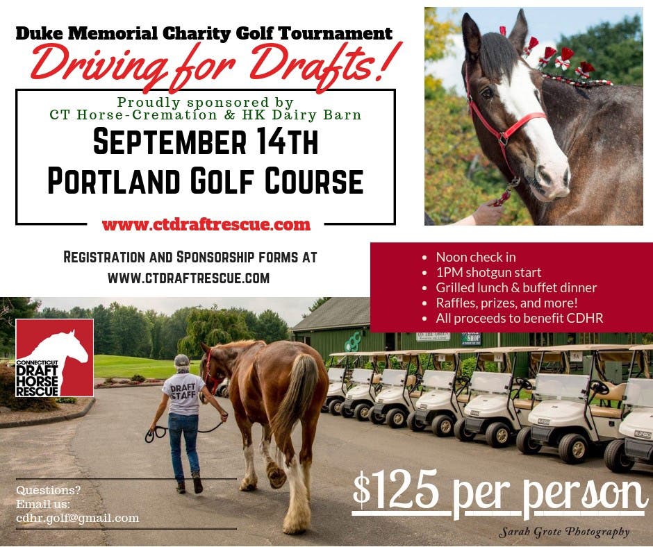 In 2015, the CT Draft Horse Rescue rescued a neglected, emaciated Clydesdale from shipping to a slaughter auction in PA to soon discover that this horse was Duke, a former Budweiser Clydesdale. As he regained his health, Duke quickly became a local celebrity at CDHR, making appearances at events, including the golf tournament, and posing for pictures with visitors. Sadly, Duke passed away about a year after his rescue, surrounded by his loving volunteer caretakers. To honor Duke’s memory, CDHR named this annual golf tournament after him.