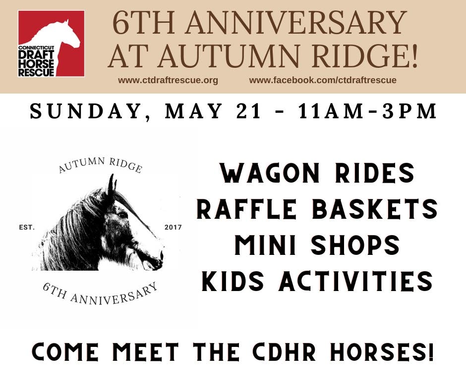 Come celebrate the 6th Anniversary at Autumn Ridge, the farm for the Connecticut Draft Horse Rescue (113 Chestnut Hill Rd, East Hampton, CT 06424) on Sunday, May 21st. Admission is FREE! Come meet the CDHR horses from 11am - 3pm. There will be vendors, raffles, wagon rides, and fun for the entire family! There will be plenty of parking in the hayfield or along the street, if needed. This event is rain or shine. Want to be a vendor? Click the vendor form for details: https://www.ctdraftrescue.org/vendorform. The CT Draft Horse Rescue is a non-profit organization dedicated to saving the lives of neglected or abused draft horses as well as draft horses heading to slaughter. For more information visit www.ctdraftrescue.org, www.facebook.com/ctdraftrescue, or send an email to ctdraftrescue@aol.com.