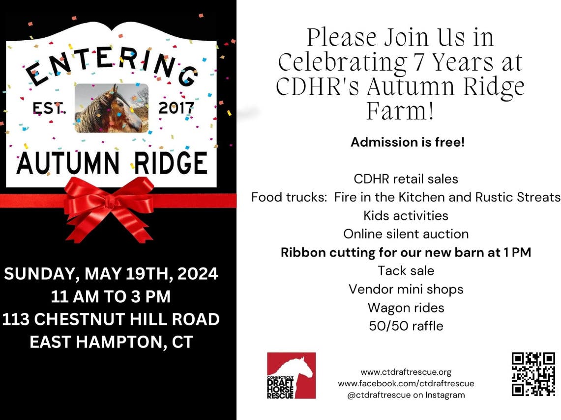 Come celebrate the 7th anniversary at Autumn Ridge, the farm for the Connecticut Draft Horse Rescue (113 Chestnut Hill Rd, East Hampton, CT 06424) on Sunday, May 19th. Admission is FREE! Come meet the CDHR horses from 11am - 3pm. There will be vendors, raffles, wagon rides, and fun for the entire family! Delight your taste buds with offerings from two food trucks: Fire in the Kitchen and Rustic Streats. Explore the new barn and witness the ribbon-cutting ceremony at 1pm. This event is rain or shine. The CT Draft Horse Rescue is a non-profit organization dedicated to saving the lives of neglected or abused draft horses as well as draft horses heading to slaughter. For more information visit www.ctdraftrescue.org, www.facebook.com/ctdraftrescue, or send an email to ctdraftrescue@aol.com.