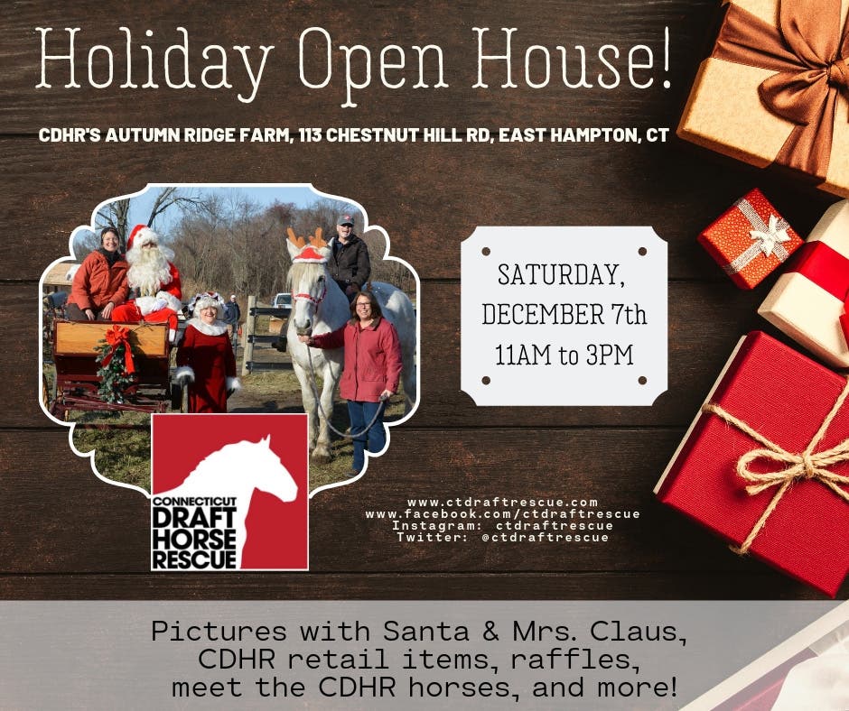 Come join us on Saturday, December 7th, for the annual Holiday Open House at the Connecticut Draft Horse Rescue from 11am - 3pm (113 Chestnut Hill Rd, East Hampton CT 06424). There will be food, photos with Santa and Mrs. Claus, raffles, vendors, and more.