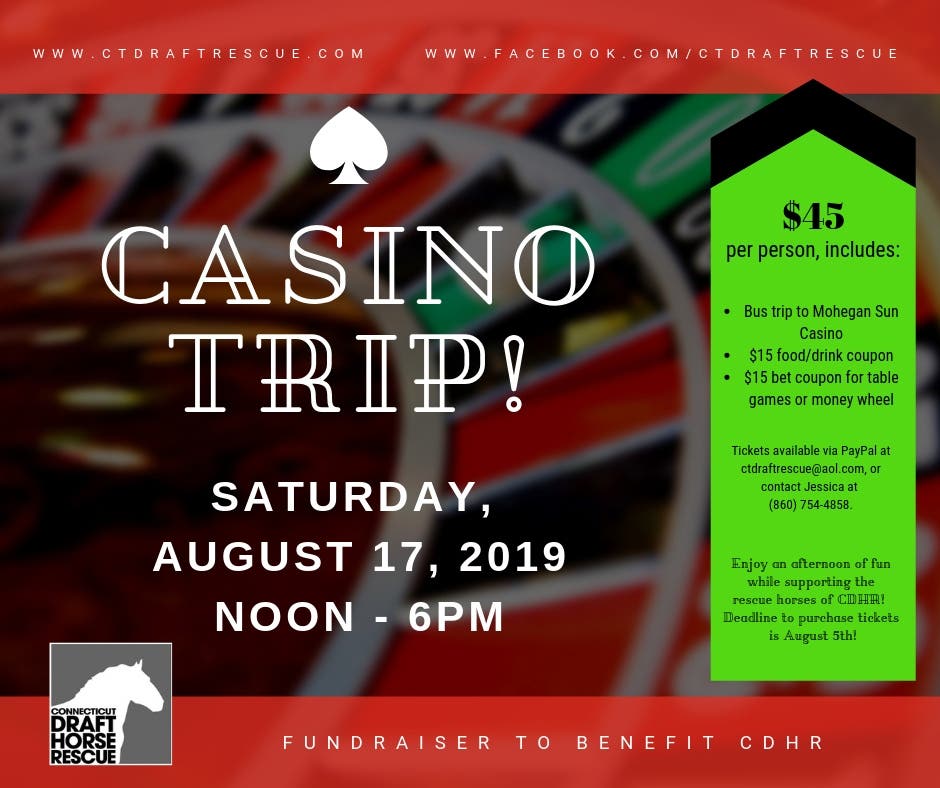 Tickets must be purchased by August 5th via PayPal at ctdraftrescue@aol.com (reference "Casino Trip"). Questions? Contact Jessica at (860) 754-4858.
