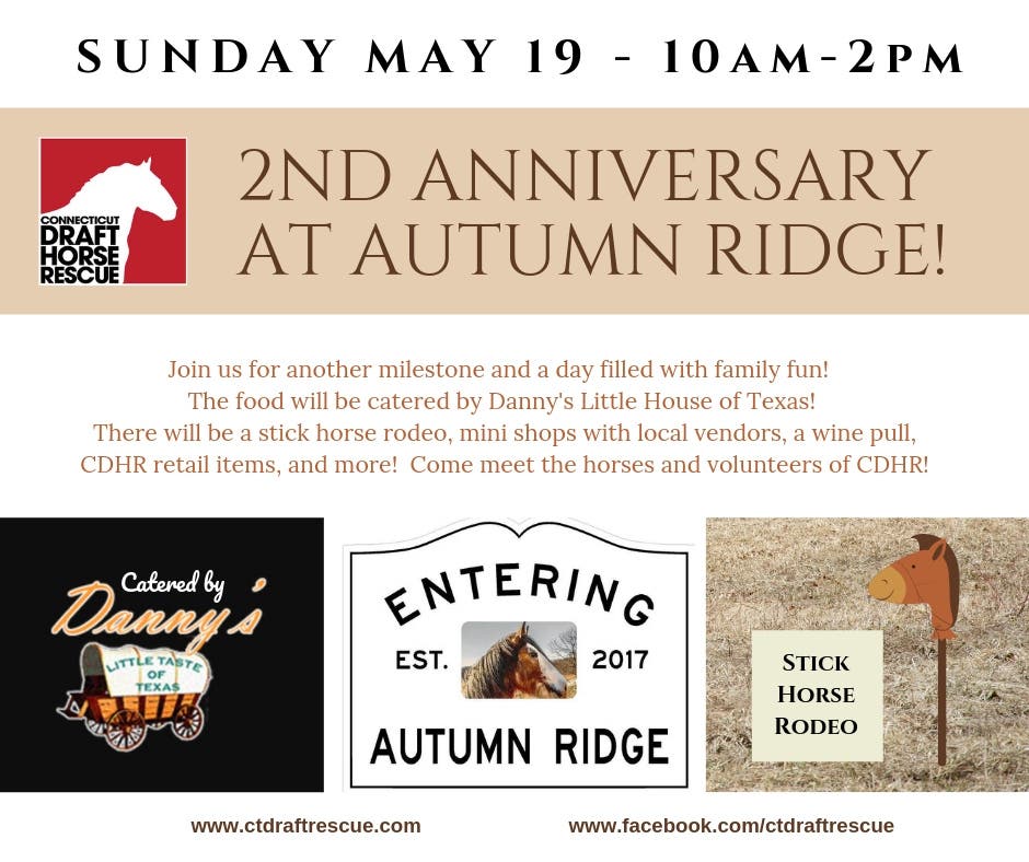 Please join us on Sunday, May 19th from 10am-2pm for another milestone with a day filled with family fun! The food will be catered by Danny's Little House of Texas. There will be a stick-horse rodeo, mini shops with local vendors, a wine pull, CDHR retail items, and more. Come meet the horses and volunteers of CDHR (113 Chestnut HIll Rd., East Hampton, CT 06424). This event is free. For more information: www.facebook.com/ctdraftrescue or www.ctdraftrescue.com.