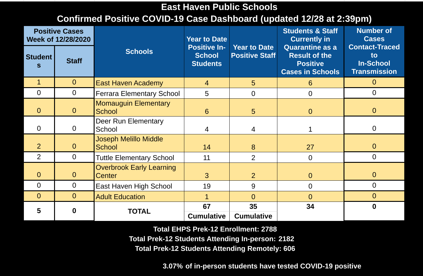 As of Dec. 28, 35 East Haven school teachers and staff members have tested positive for COVID-19. Sixty-seven students have tested positive.