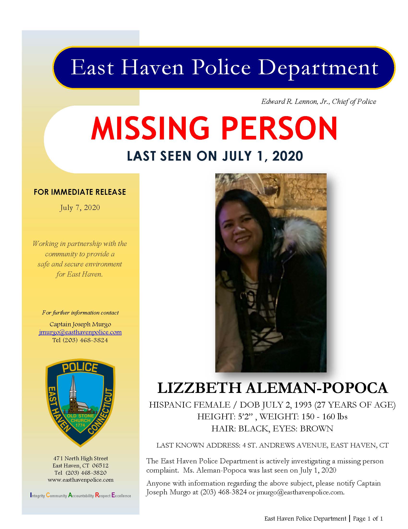 Aleman-Popoco is Hispanic, 5 feet, 2 inches, with black hair and dark brown eyes. It is unknown what she was last wearing. Anyone with information regarding her whereabouts is asked to contact Capt. Joseph Murgo at 203-468-3824 or jmurgo@easthavenpolice.com.
