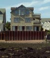 This house features a 1,000-square-foot deck and stairs leading to the beach.