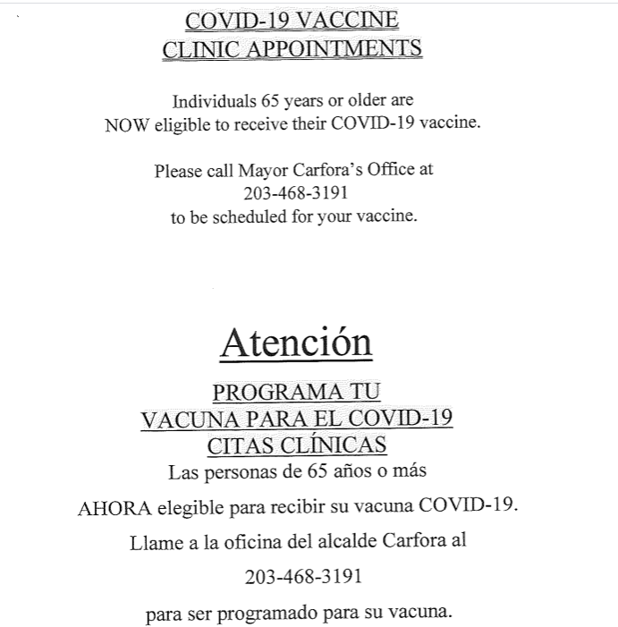 Benivegna said the mayor's office has a dedicated line just for those currently eligible, ages 65 and up, to get help scheduling a vaccine. Call 203-468-3191 if you need assistance, she said.