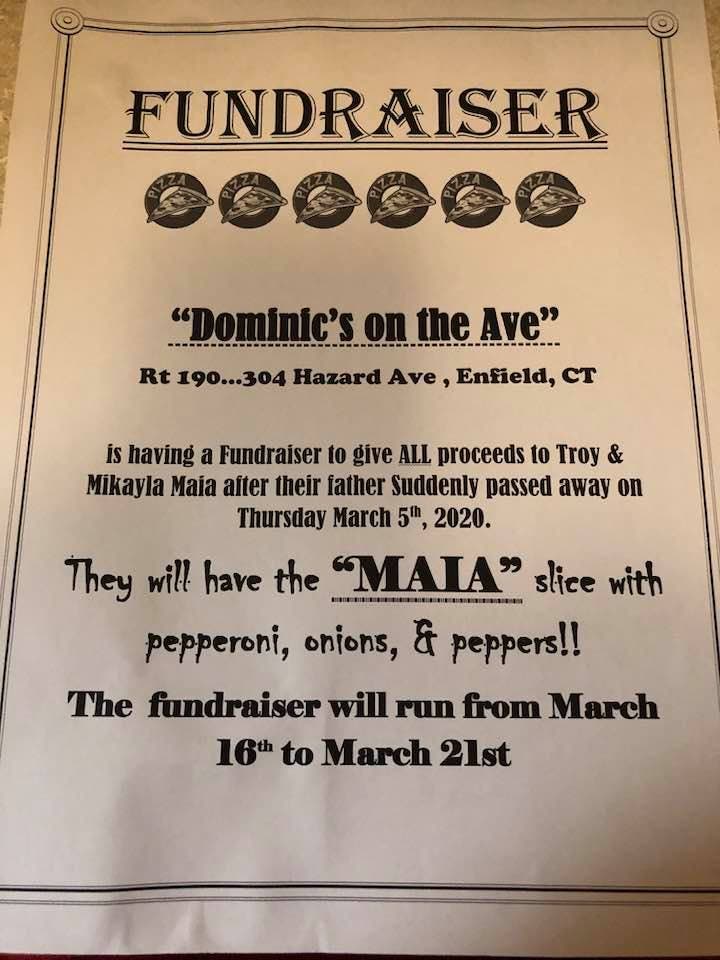 Joe Zucco, owner of the newly-opened Dominic's On the Ave on Route 190 in the Hazardville section of Enfield, will be preparing a special pizza slice next Monday through Saturday, March 16-21. Containing pepperoni, onions and peppers, the generously-sized portion will be called "the Maia Slice," and proceeds from all sales of the special $5 slice will be donated to aid Maia's children.