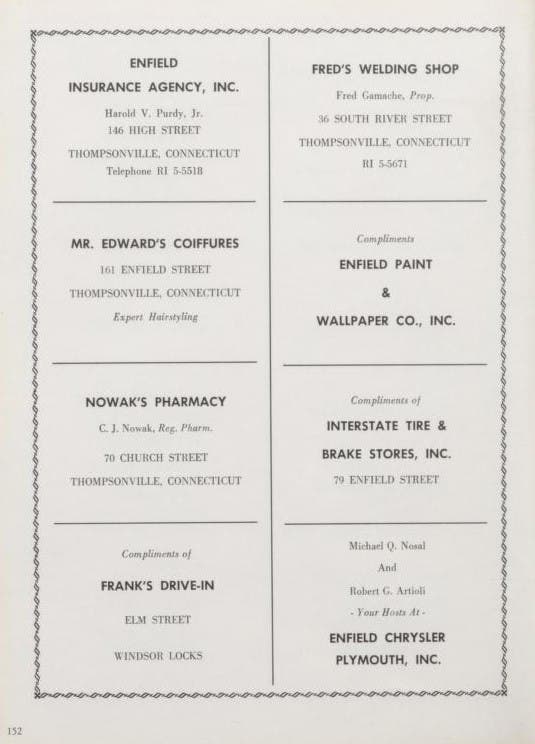The Piorek family owned the business as far back as the 1960s, as shown on page 152 of the 1965 Enfield High School Yearbook. (Enfield Historical Society via archive.org)