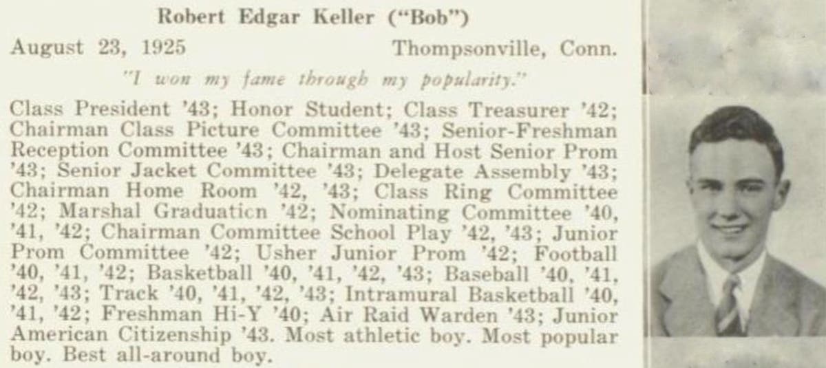 Keller was a rare four-sport athlete in high school, competing in football, basketball, baseball and track. He was president of the Enfield High School Class of 1943, served on numerous school committees, and as a senior, he was voted most athletic, most popular and best all-around boy.