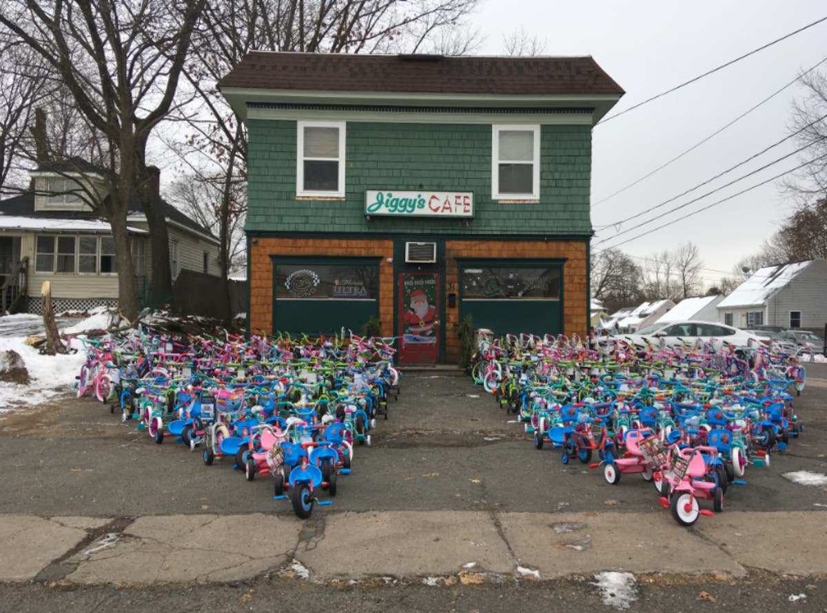 On Monday morning, Jiggy's Café at 41 Enfield Street donated 200 brand new tricycles and bicycles to the Toys For Joy program. One hundred bikes were picked up by the Salvation Army in Springfield, and 100 more went to the Enfield Police Department’s Toys for Joy program.