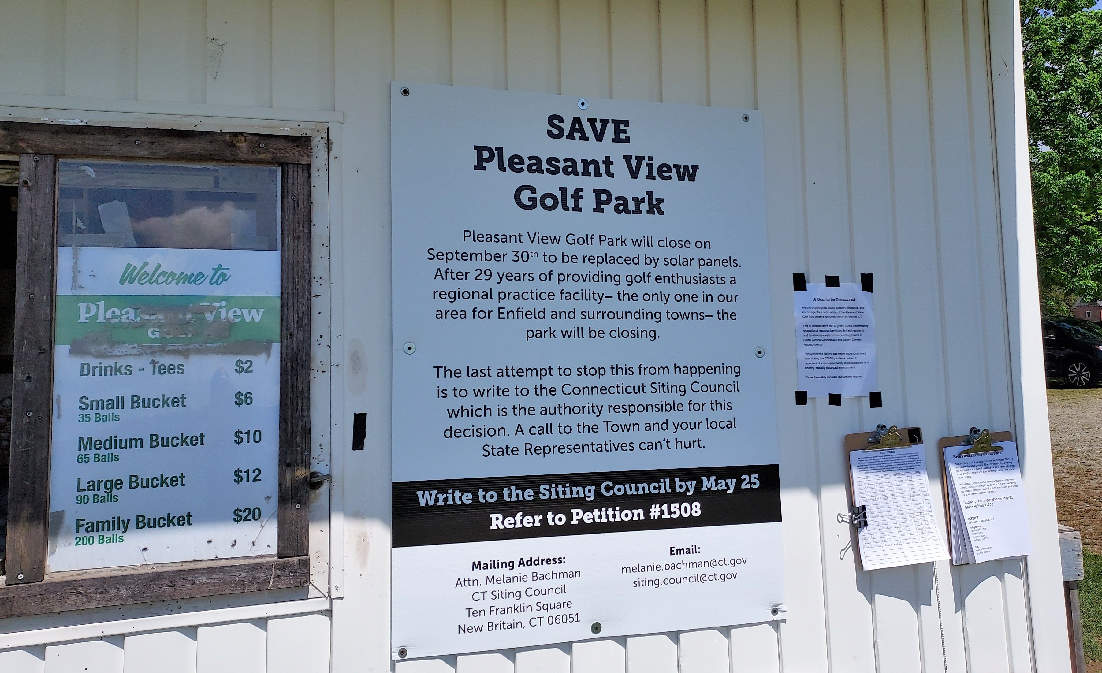 A petition has been started at the driving range by residents who do not wish to lose the only golf practice facility in the area. A sign at the center points out the siting council is ignoring one of its primary responsibilities listed on the State of Connecticut website, "to minimize damage to scenic, historic and recreational values."
