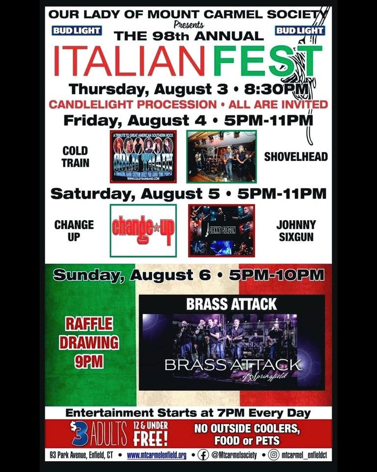 ENFIELD, CT — For the 98th time since 1926, residents of north-central Connecticut and western Massachusetts will soon be celebrating tradition, sampling wonderful homemade delicacies and enjoying a variety of live music at the annual Italian Festival, sponsored by the Our Lady of Mount Carmel Society.