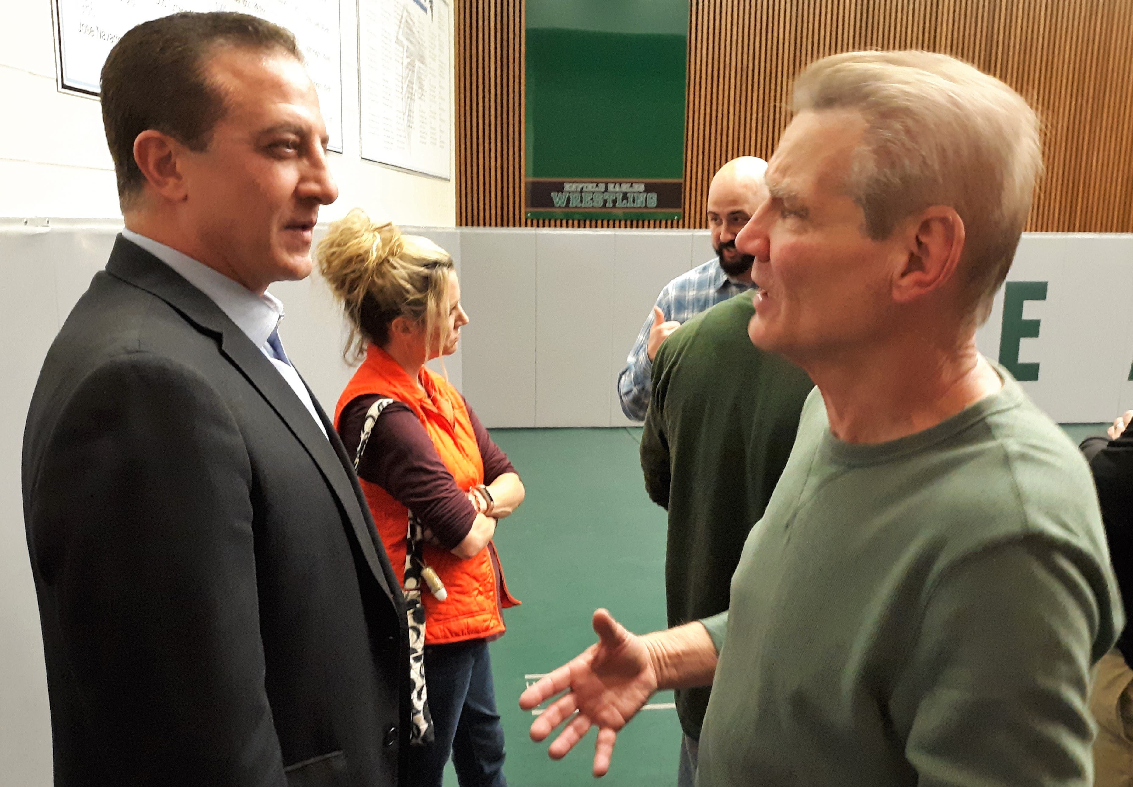 Ben Aleks, right, chats with 1982 State Open champion Bob Andreana during the wrestling room's dedication in May. (Photo credit: Tim Jensen/Patch Media Corp.)