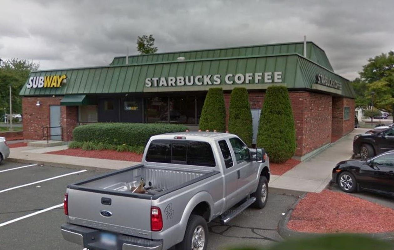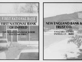 Also depicted is New England Bank & Trust Co. at 9 Hazard Avenue, in front of the former Enfield Suburban Mall and adjacent to the south entrance to Enfield Square. Established in 1971, the bank was open until moving its headquarters to Windsor on June 27, 1988. A Quiznos Sub franchise was located briefly in the eastern side of the building, and was replaced several years ago by a Starbucks coffee shop. A Subway sandwich shop currently occupies the western half of the site.