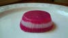 I tried layering; I poured red-dyed bergamot soap base into a liner, let it set a bit, then topped it with white ylang ylang scented base, let that cool, then more red. You can see the final result in the photos.