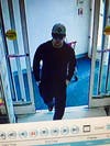 White male in his late 20s or early 30s. Clean-shaven, however, he may have facial hair under his chin only. Last seen wearing black pants and a long sleeved black shirt, carrying a black backpack and wearing black glasses with a blue reflection. He was also seen wearing a beige a baseball cap with a round logo on the front.