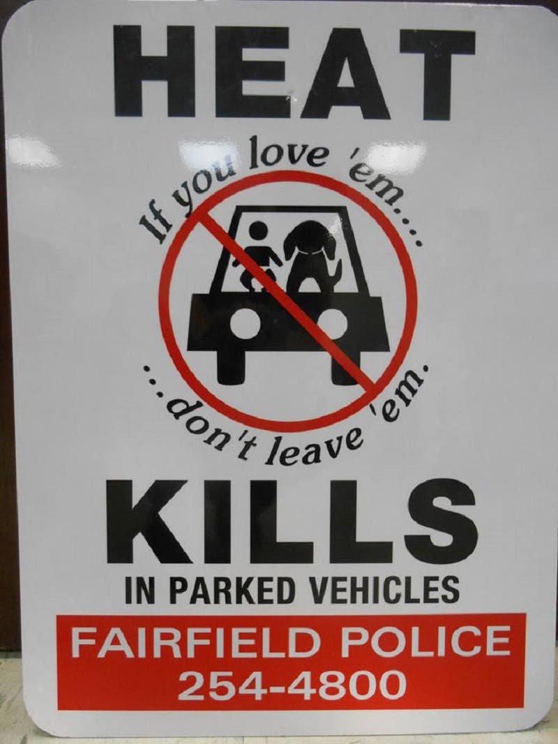 The signs are metal 18’’x 24’’ and reads “Heat Kills in parked vehicles if you love ‘em don’t leave ‘em Fairfield Police 254-4800.”
