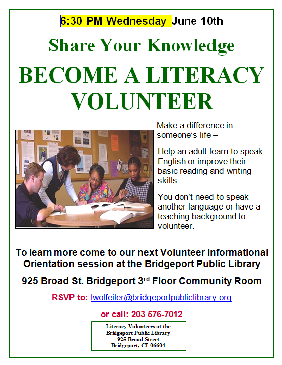 Literacy Volunteers of Greater Bridgeport Orientation/Information Session June 10th 6:30pm at the Bridgeport Public Library