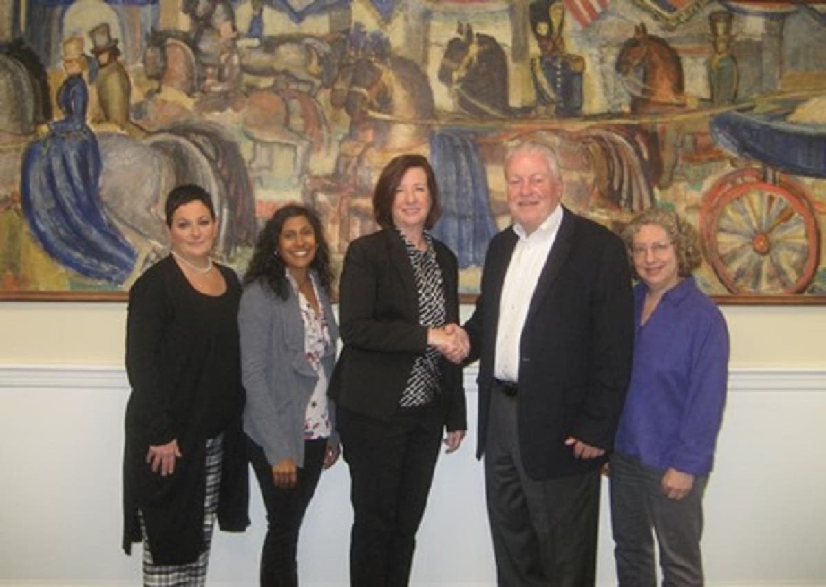 Pictured, from left to right: Danielle Sharp, Director of Development, Friends of Fairfield Public Library, Board of Library Trustees Chair Sonal Rajan, Town Librarian Dr. Helene Murtha, First Selectman Mike Tetreau and Friends of Fairfield Public Library President Margo Kaminsky / Contributed photo