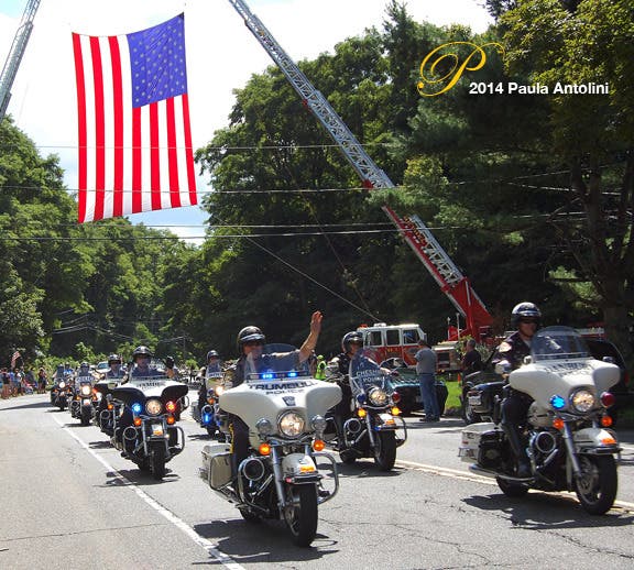 The motorcade was met with cheers and waves by the many Bethel residents, and Bethel and New Fairfield fire fighters, who lined the street, as cycles passed under the large flag. Fire department sirens were blaring the entire time the parade was in progress, to greet the riders.