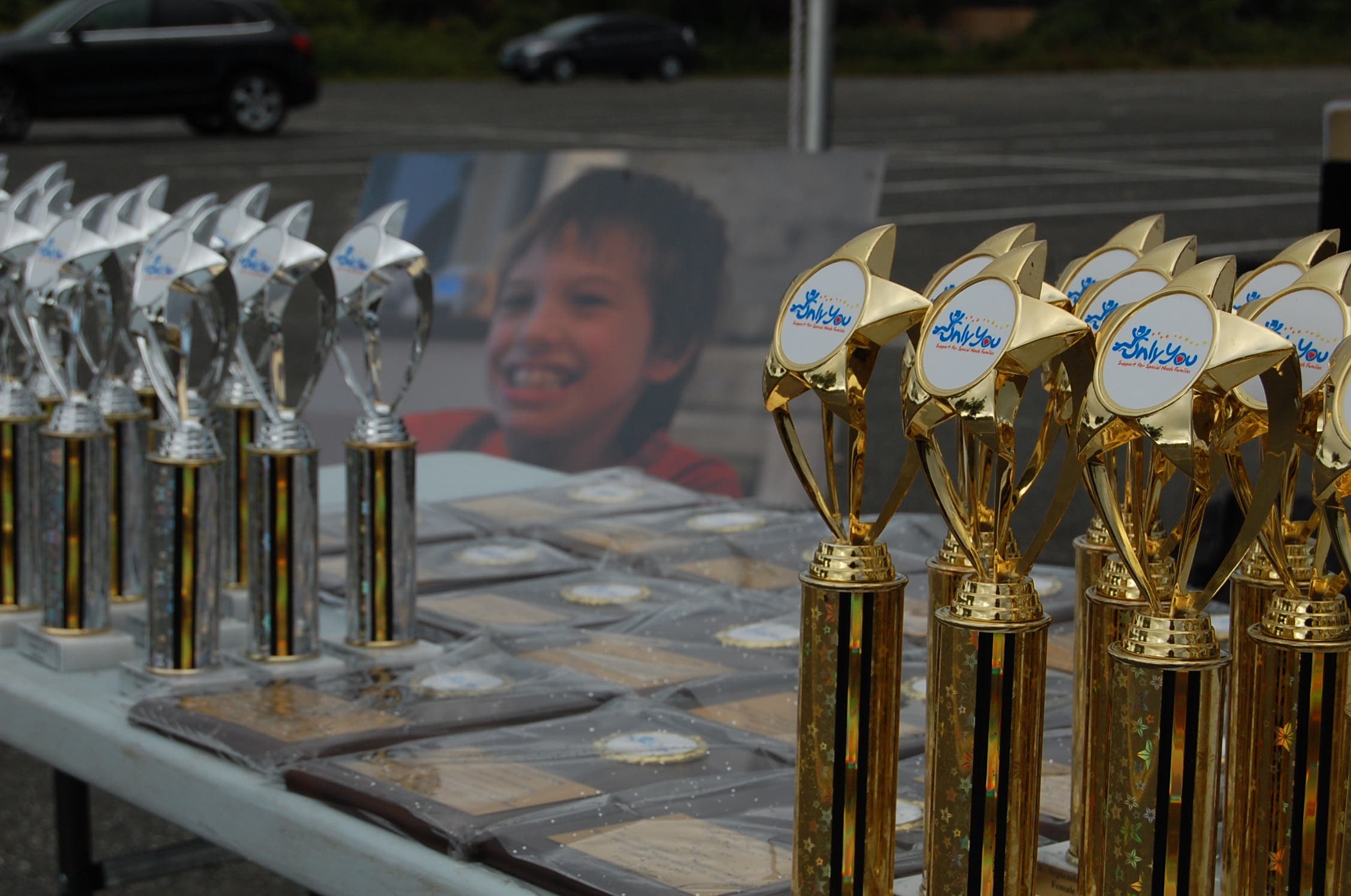 (Pictured: The trophy table at the Only You 5 K race with Mikey Fedak’s picture in the background)
