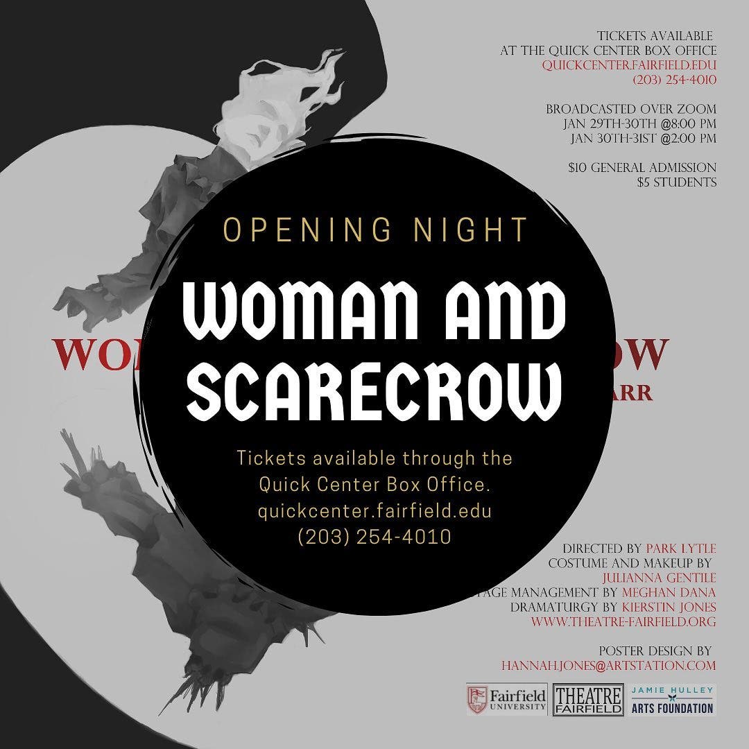 FAIRFIELD, Conn. (January 14, 2021) — Theatre Fairfield, Fairfield University’s resident production company, kicks off the New Year with four performances of British playwright Marin Carr’s dramatic play, “Woman and Scarecrow.” In compliance with state and local Covid-19 gathering restrictions, the show’s four, entirely student-run performances will be livestreamed via YouTube on Friday, January 29, at 8 p.m.; Saturday, January 30, at 2 p.m. and 8 p.m.; and Sunday, January 31, at 2 p.m.