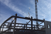 Structural steel emerges from the ground where tomorrow's hospital tower will stand beside today's, marking another milestone in the UConn Health campus transformation under Bioscience Connecticut.