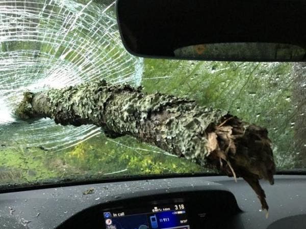 Ken Anthony was driving on Route 4 when a dead tree toppled over, apparently by the strong winds, and a branch smashed the windshield.
