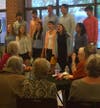 Students select their own music that is appropriate for this audience. The program varies each year depending upon student interest and choice. This year the program began with a chamber group performing a string quartet by composer, Alexander Borodin. Choral groups of various voicing performed renaissance pieces, sea chanteys, Beatles' song in addition to other selections. Small groups with voices were accompanied by piano, ukeleles and guitars performed a range of music from Frank Sinatra tunes to popular songs of the day. An addition to the program last year, a sing-along song section, was instituted by a student leader and now has become a popular annual component.