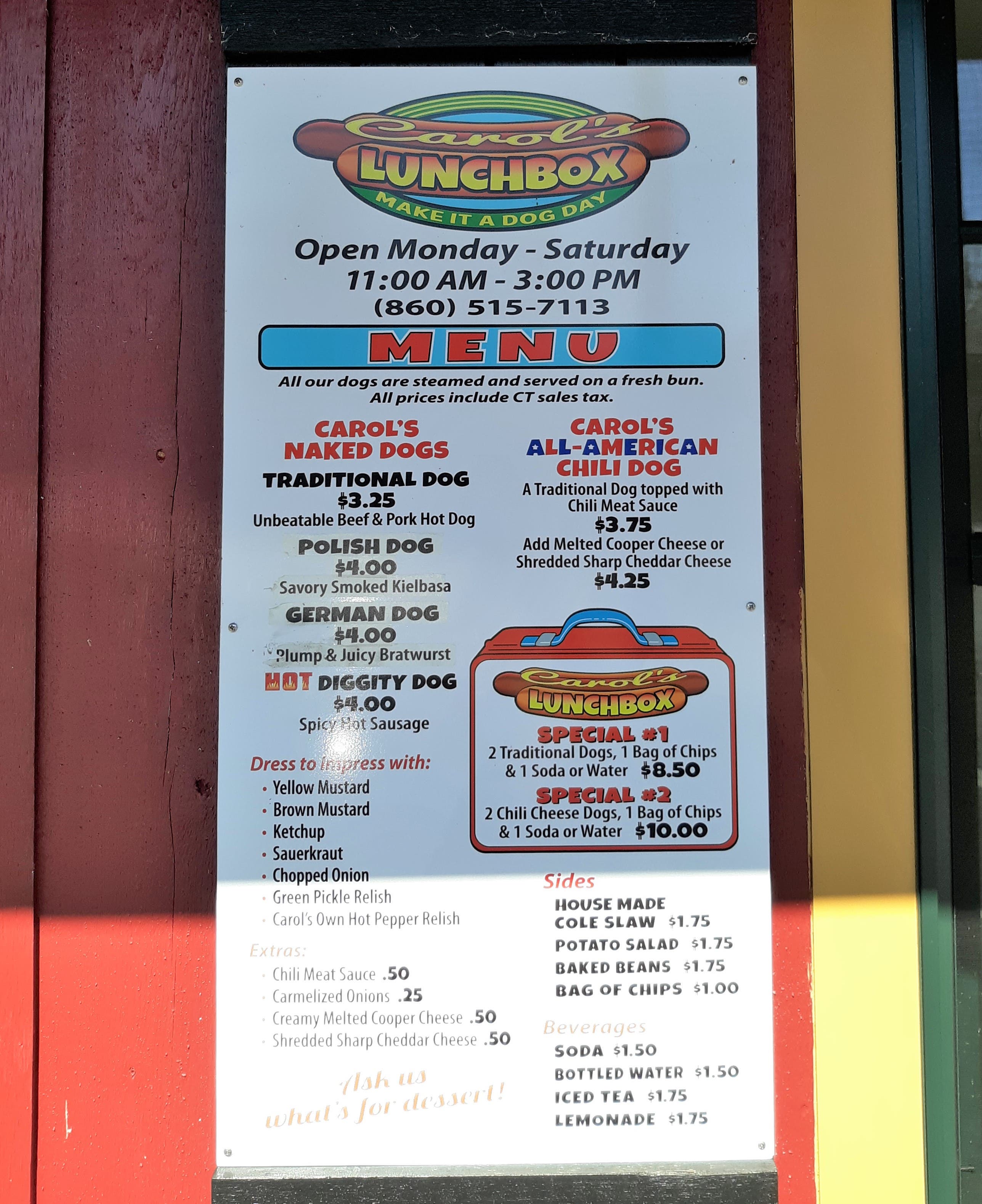 Her passion for food, particularly hot dogs, led to the creation of Carol's Lunchbox in May 2017. The takeout stand features locally made hot dogs, savory smoked kielbasa, plump and juicy bratwurst and spicy hot sausage, with a variety of toppings including a housemade hot pepper relish, green pickle relish, chopped onions and sauerkraut.