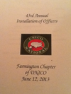 Officers for 2013-2014 were sworn in at this evening's Installation Dinner at Apricot's of Farmington. Congratulations to Frank Dolce, President, Paul Pedemonti, Vice President, Robert McNally, Treasurer, Lisa Sweeney, Recording Secretary, Virginia Mugavero, Corresponding Secretary, Jim Mugavero, Sergeant at Arms, and Ralph Arcari, Chairman.