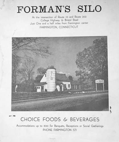 George and Ethel Forman converted a 19th century cow barn, complete with silo, into Forman's Silo Restaurant in 1936. Featuring "accommodations up to 500 for banquets, receptions or social gatherings," the facility was listed at the time as being located "at the intersection of Route 10 and Route 202, College Highway and Bristol Road, just one and a half miles from Farmington center." A clear indication of the antiquity of the full menu cover seen below is the phone number: FARMINGTON 571.