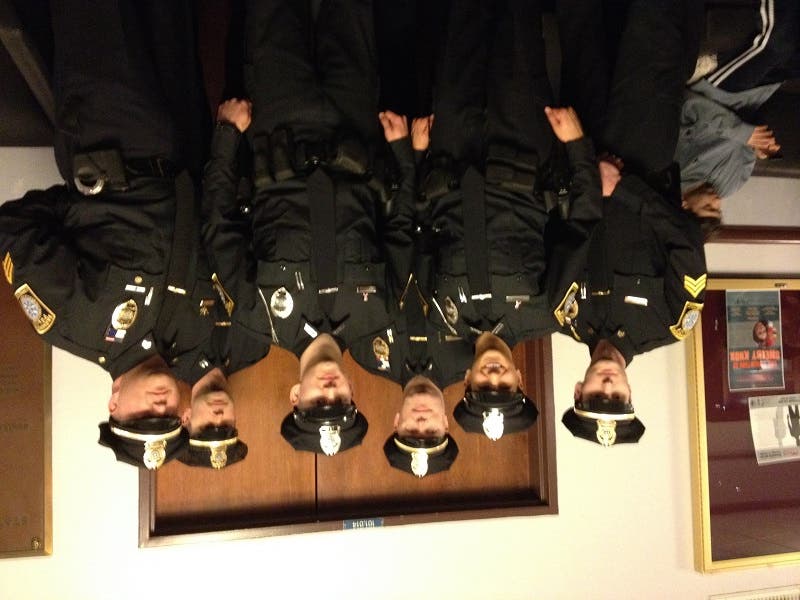 Photo caption: Center left is Officer Alicia Catania and center right is Officer Alexander Jones. Behind them are Farmington supervisors Sergeant Kory Vincent, Lieutenant Colin Ryan, Captain Marshall Porter andSergeant Troy Williams.