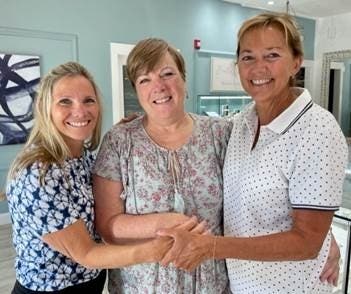 (from left) The best friend trio of Nicole Herlands, Jean Miller, and Cyndi Jennings of Glastonbury were recently fitted with permanent jewelry at Baribault Jewelers in Glastonbury. The long-time friends wanted the bracelets as a visual and beautiful reminder of their special, caring bond.