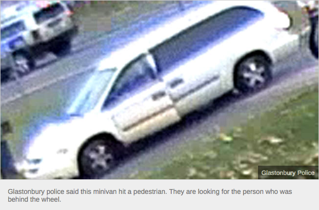 The driver of a white Dodge Caravan who hit a pedestrian in front of the Welles-Turner Memorial Library on Main Street about 4:20 p.m. on Tuesday, Nov. 11, is being sought by Glastonbury police, according to NBC Connecticut.