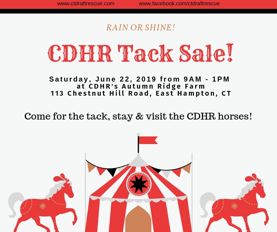 The CT Draft Horse Rescue (CDHR) will be hosting a tack sale on Saturday, June 22nd 2019 from 9am-1pm at their Autumn Ridge farm. Available tack includes saddles, blankets, bits, supplements, and much more. All sizes and styles. New and slightly used. All proceeds go to support the horses at the Rescue. CDHR is located at 113 Chestnut Hill Rd, East Hampton CT 06424. This event is rain or shine. For more information, please visit www.ctdraftrescue.com or www.facebook.com/ctdraftrescue.