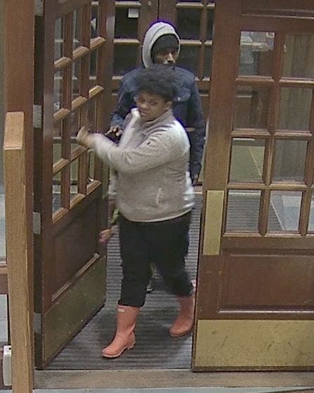 GLASTONBURY, CT — A woman wearing pink rain boots is one of two suspects in a theft case at a Glastonbury book store, surveillance images released by police show.