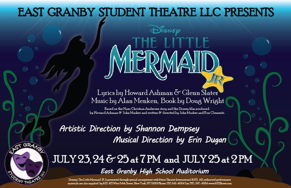 Please come to support this extremely hard-working summer program featuring over 50 of East Granby’s most talented young actors and actresses. Through the new summer program we have been able to bring theatre back to East Granby and would greatly appreciate your support and help to continue the program in the future! Disney’s The Little Mermaid Jr. is presented through special arrangement with Music Theatre International (MTI). For more information about the program please visit: eastgranbystudenttheatrellc.weebly.com.