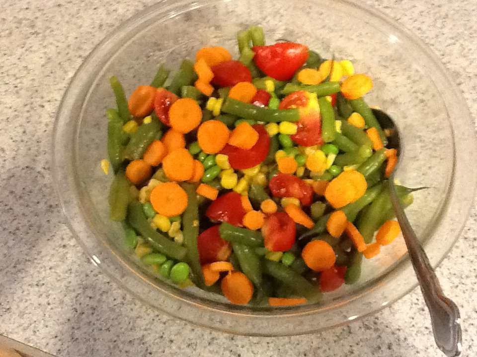 I have to confess I never did make the kale and green bean salad I linked to in my last post. Instead I used the green beans and edamame that was left over from Wednesday's market to make a 2-bean (and corn, and other stuff) salad. No recipe since unless I'm baking or canning I usually just wing it, but here's what I did: