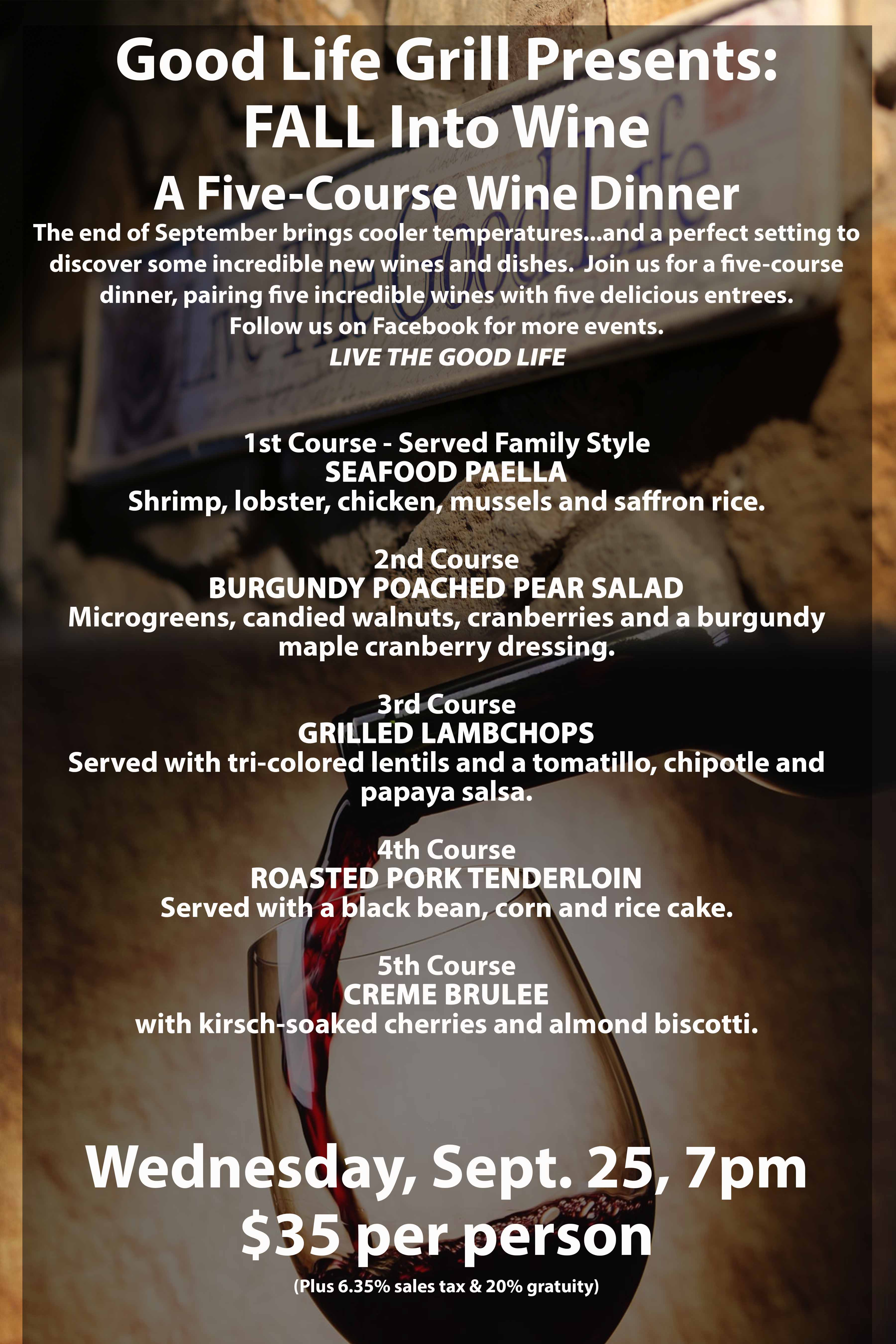 Good Life Grill is proud to introduce this incredible wine-paired five course dinner for only $35 per person (plus tax and gratuity). We welcome Brescome Barton, who will join us to talk about the different wine pairings during the meal. The menu has been designed by Executive Chef Ken Sampson.