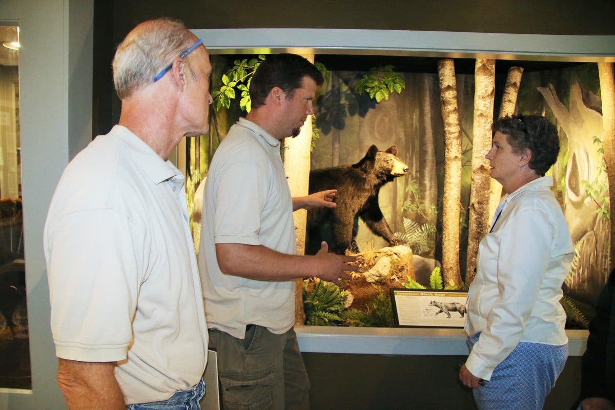 Photo: State Senator Beth Bye talks with two DEEP wildlife biologists in front of a black bear exhibit at the Sessions Woods Wildlife Management Area exhibit hall in Burlington. Photo courtesy of Senator Bye’s office.