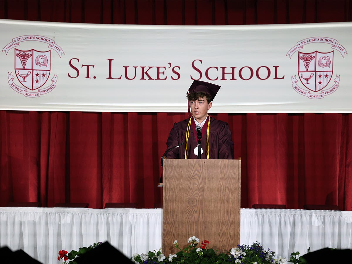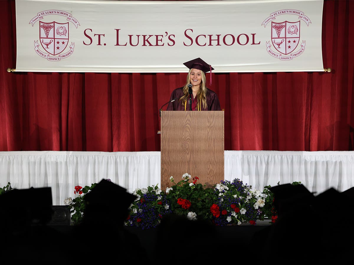 Ava Sollene gave the farewell address as the Class of 2023’s valedictorian. “Whether you’re a so-called ‘lifer’ at St. Luke’s or a classmate who joined this amazing community only two years ago, the impact St. Luke’s makes on its students is immeasurable,” she said. “Today sparks a new beginning for us all, a new series of firsts, but it also heralds the end of an era. This feeling of closure comes as a beautiful sorrow, a sentiment that stems from the departure of strong foundations and relationships we have built here. How special this place must be for the bittersweet heartache to be felt so profoundly when it is time to move on.”