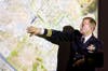 Commander Boyer spoke first of his own experience in Baghdad, where he mobilized from June to December of 2007 as an Intelligence Officer assigned to the Multi-National Force-Iraq Law and Order Task Force (LAOTF). His presentation included personal photos of his living accommodations, uniform (which he described as the equivalent of his “business attire”), weaponry and explosives and the convoy vehicles in which he traveled while in Iraq. Commander Boyer showed maps of the city of Baghdad, providing geographic and demographic background while indicating where his base, Forward Operating Base Shield, was located in the midst of it all.