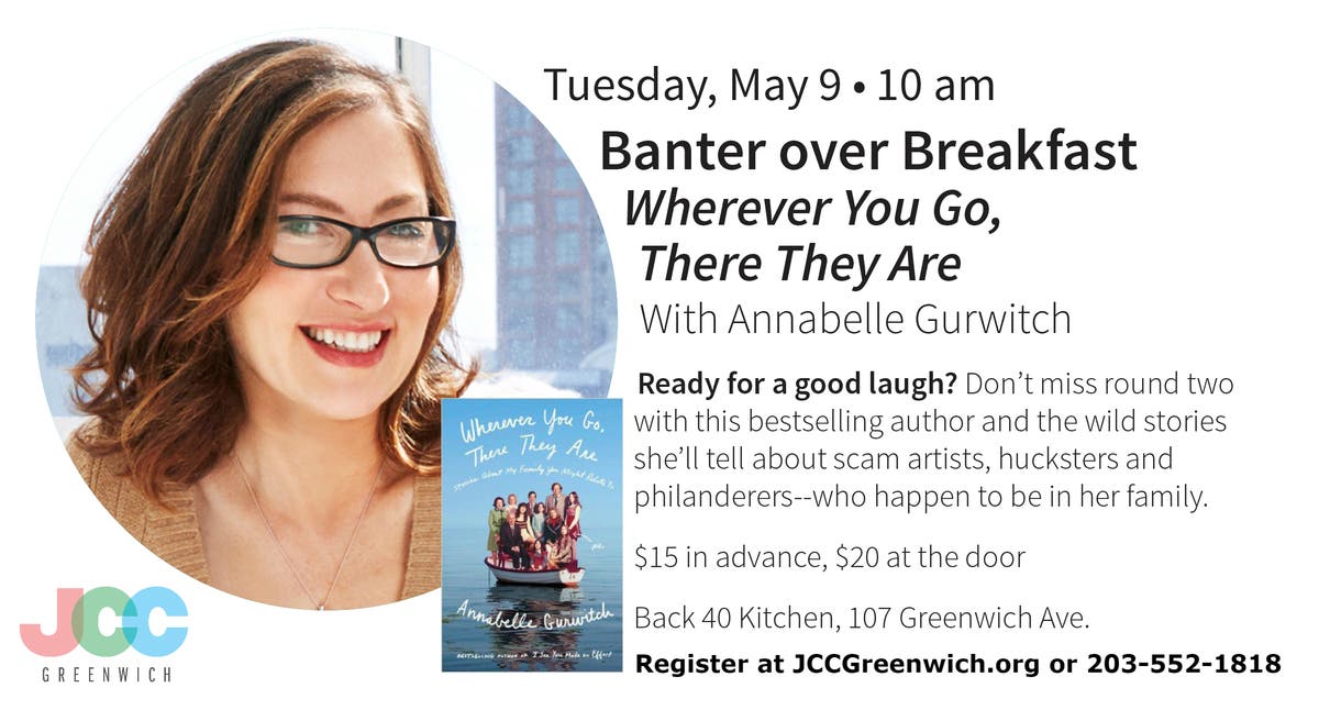 Ready for a good laugh? New York Times bestselling author Annabelle Gurwitch returns by popular demand for a book talk with JCC Greenwich. Come and hear the wild stories she'll tell from "Wherever You Go, There They Are" (Blue Rider Press), a hysterically funny and slyly insightful new collection of essays about her own family of scam artists and hucksters, as well as the sisterhoods, temporary tribes, communities, and cults who have become surrogates along the way.