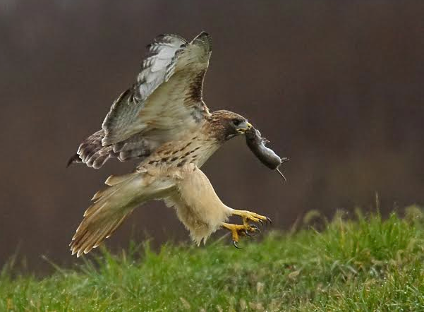This Redtailed hawk dove down less than 50 feet from where I was standing and came up with it’s lunch; a vole (small mouse-like rodent). Using my new Sony A77 - Mark 2 DSLR (digital camera) coupled with my Tamron 150-600mm telephoto lens, I fired off well over 50 photos of the hawk and got this one as it moved to higher ground to feast on its freshly-caught meal.
